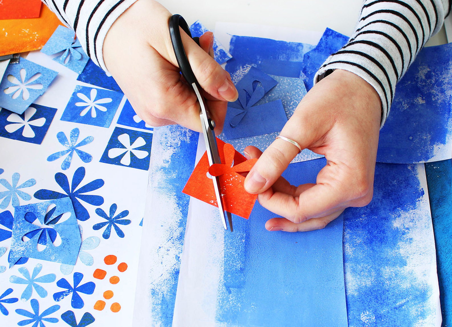 I transfer my paper collages to the computer by scanning them in. Any final adjustments can then be made using Photoshop and I often experiment layering up different sections and shapes, finding my favourite composition.
